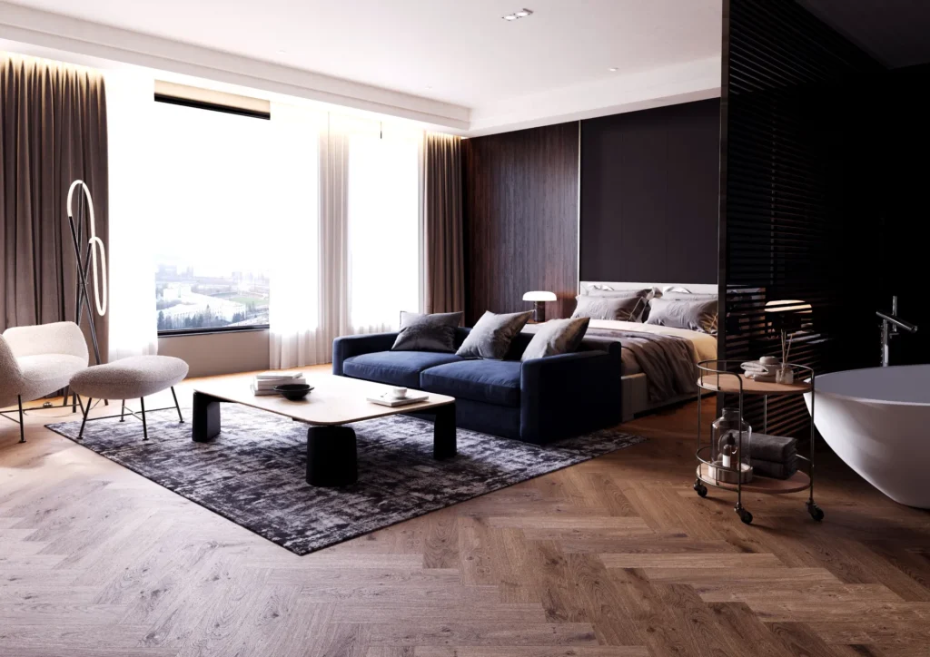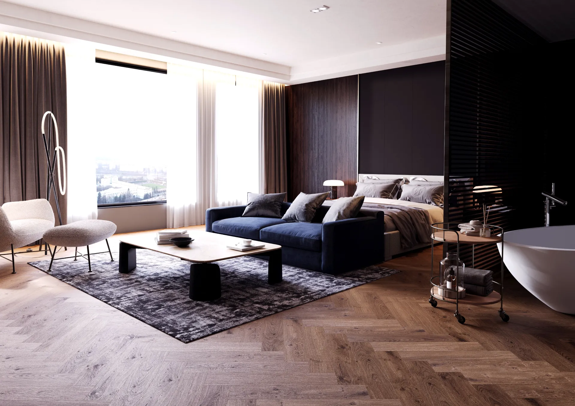 Royal Castle to podłoga, która łączy klasyczne piękno jodełki i naturalnego drewna z nowoczesną trwałością i praktycznością – idealna do wnętrz klasycznych, modern classic i współczesnych.