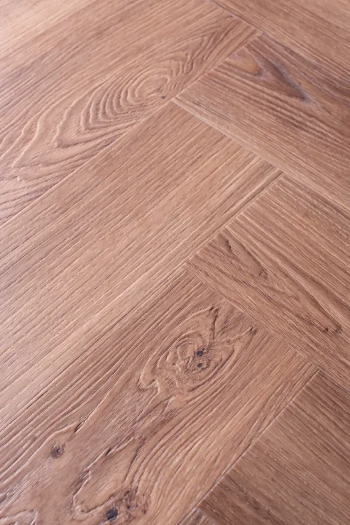 Del Monte to dekor o wyrazistej, ciepłobrązowej tonacji, w której naturalne usłojenie drewna staje się ważnym elementem estetycznym. Widoczne, miękko poprowadzone linie słojów oraz delikatnie podkreślone sęki dodają powierzchni głębi i autentycznego charakteru. Bogatsza kolorystyka nadaje podłodze szlachetny, harmonijny wyraz, a układ jodełki porządkuje przestrzeń i podkreśla jej klasyczny rytm.