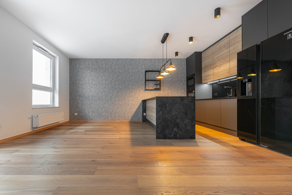Dzięki temu, że w środku paneli jest rdzeń kamienny produkt jest bardzo stabilny wymiarowo i nie ma potrzeby robienia dylatacji między pomieszczeniami.
