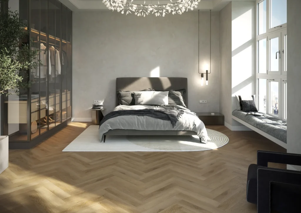 Royal Castle to podłoga, która łączy klasyczne piękno jodełki i naturalnego drewna z nowoczesną trwałością i praktycznością – idealna do wnętrz klasycznych, modern classic i współczesnych.