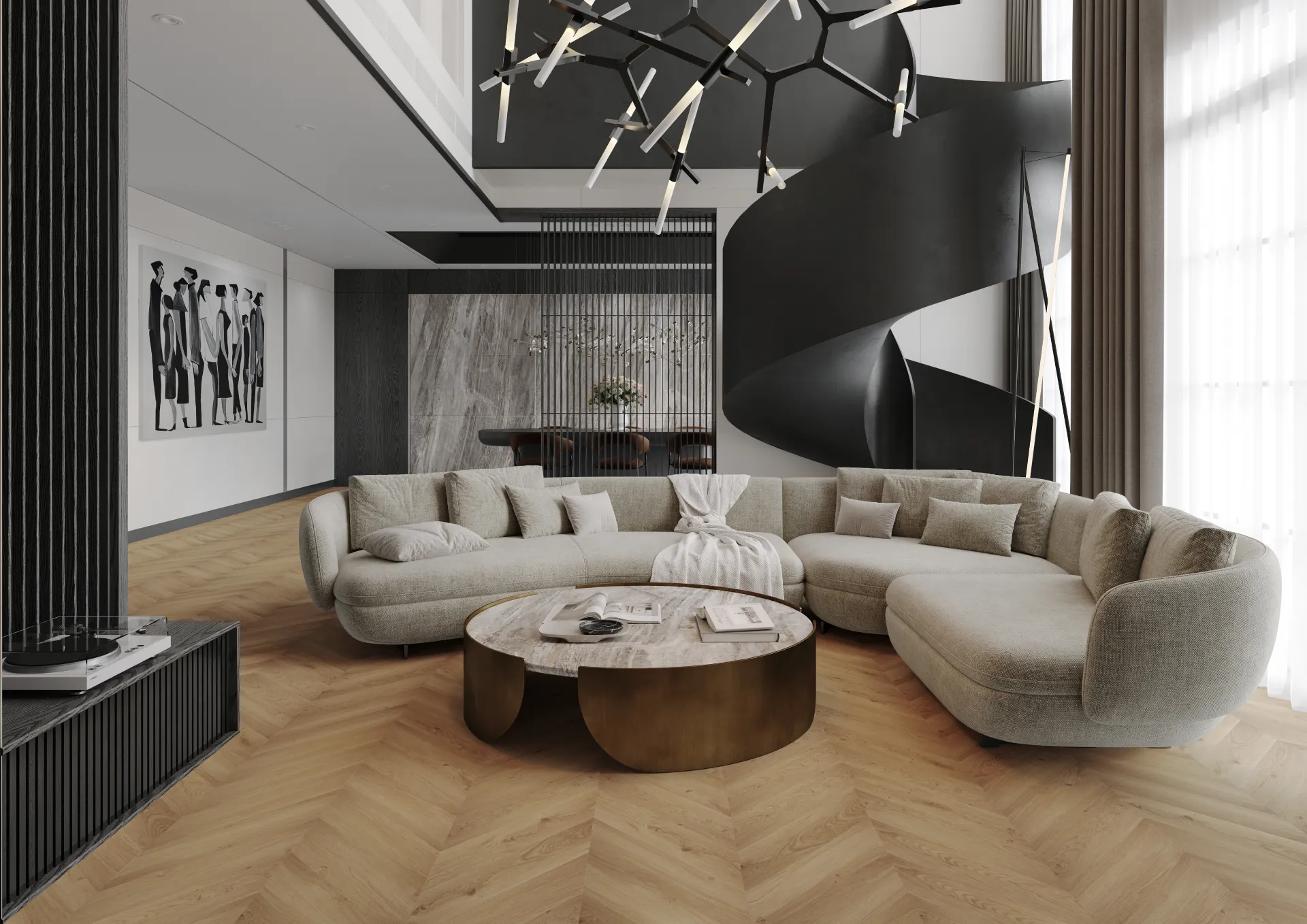 Chevron to podłoga, która łączy ponadczasową elegancję jodełki francuskiej z funkcjonalnością nowoczesnych paneli winylowych – doskonała do wnętrz klasycznych, modern classic i współczesnych, w których geometria wzoru podkreśla charakter przestrzeni.
