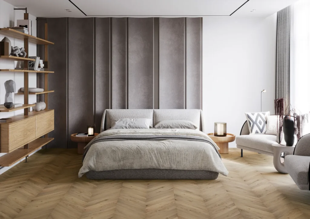 Chevron to podłoga, która łączy ponadczasową elegancję jodełki francuskiej z funkcjonalnością nowoczesnych paneli winylowych – doskonała do wnętrz klasycznych, modern classic i współczesnych, w których geometria wzoru podkreśla charakter przestrzeni.